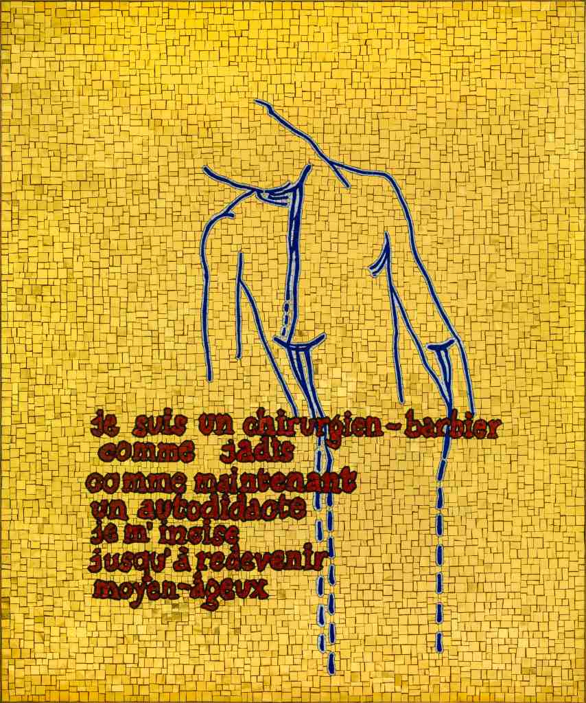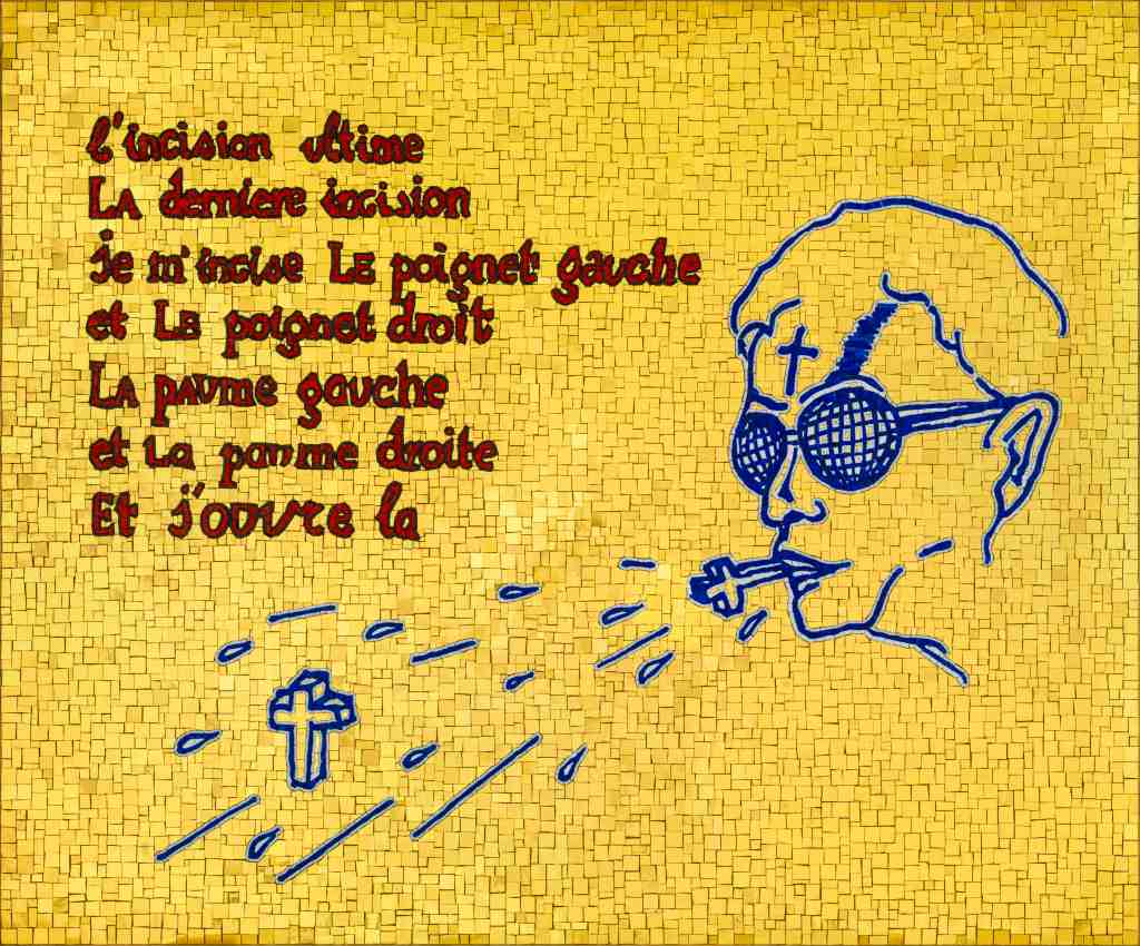 The I Am Blood series, comprises 24-karat gold tiles and smalti mosaics. Jan Fabre, renowned for his “Renaissance approach”, intertwines art, literature, theatre, dance and music with mythology, fairy tales, craftsmanship and science. This series visually reinterprets the themes of Fabre’s iconic performance, Je suis sang, originally commissioned by the 55th Festival d’Avignon for the Cour d’Honneur in 2001, which was exceptionally re-performed in the same festival in 2005. Presented as a medieval poem written and brought to life through direction, choreography and scenography, by Fabre himself, the performance left an indelible mark on the art world with its profound focus on the fundamental component of human existence — blood. The exhibition at Crux Galerie is enriched by a number of HB pencil and blood drawings on paper, created in 2005, when Je suis sang was travelling in other cities and festivals. Two decades later, during the pandemic, the artist revisited this thematic framework and created a new series using exclusively the technique of mosaic. The works stand out for their minimalist aesthetic, in terms of colour (mainly gold) and form, and are a unique expression of the artist’s multi-dimensional creativity. Through this recent body of works, Fabre continues to challenge, inspire and move, bringing out beauty through the simplicity and timelessness of forms, while honouring ancient techniques.